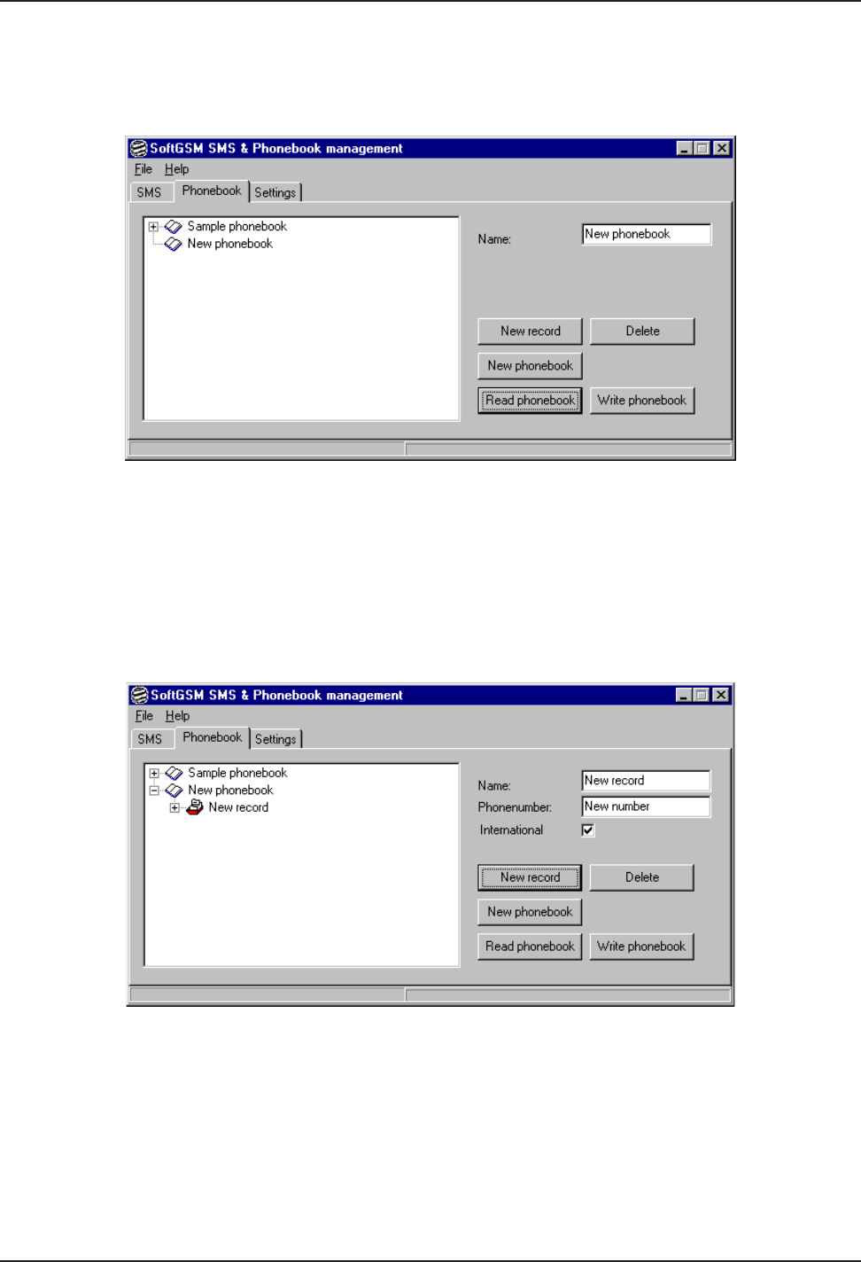 From the SoftGSM SMS & Phonebook management dialog box, Phonebook tab, highlight the tree