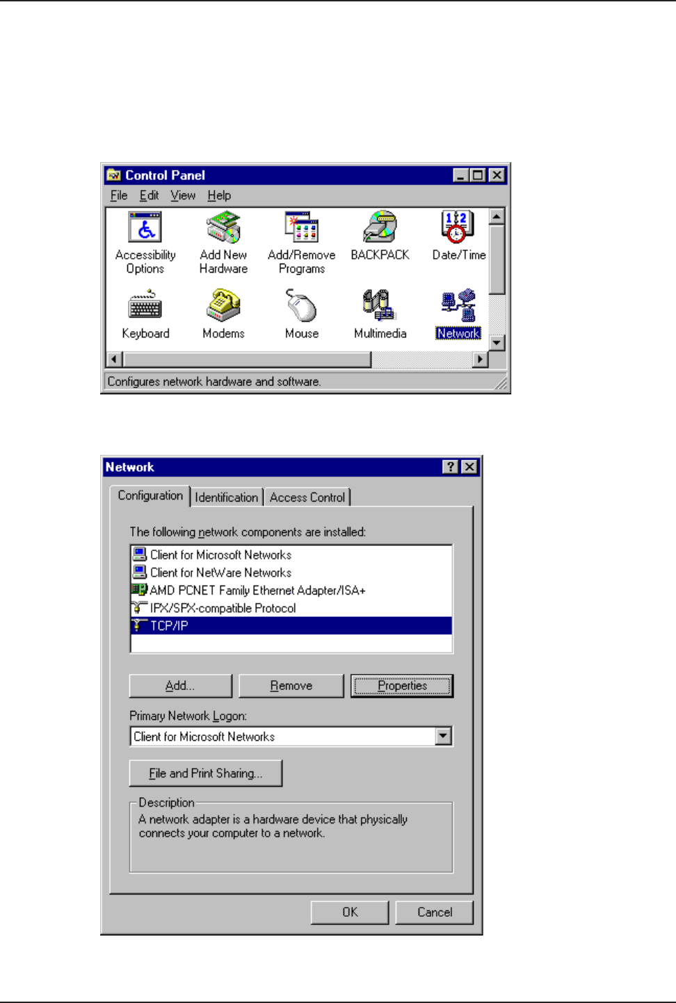 1 Click Start | Settings | Control Panel and then double-click the Network icon.