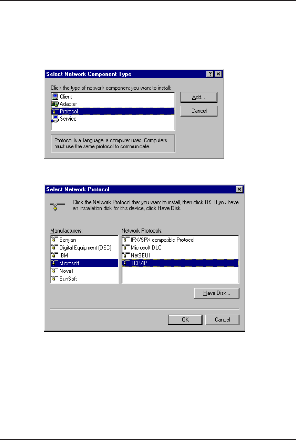 2 Select Protocol and click Add. The Select Network Protocol dialog is displayed with