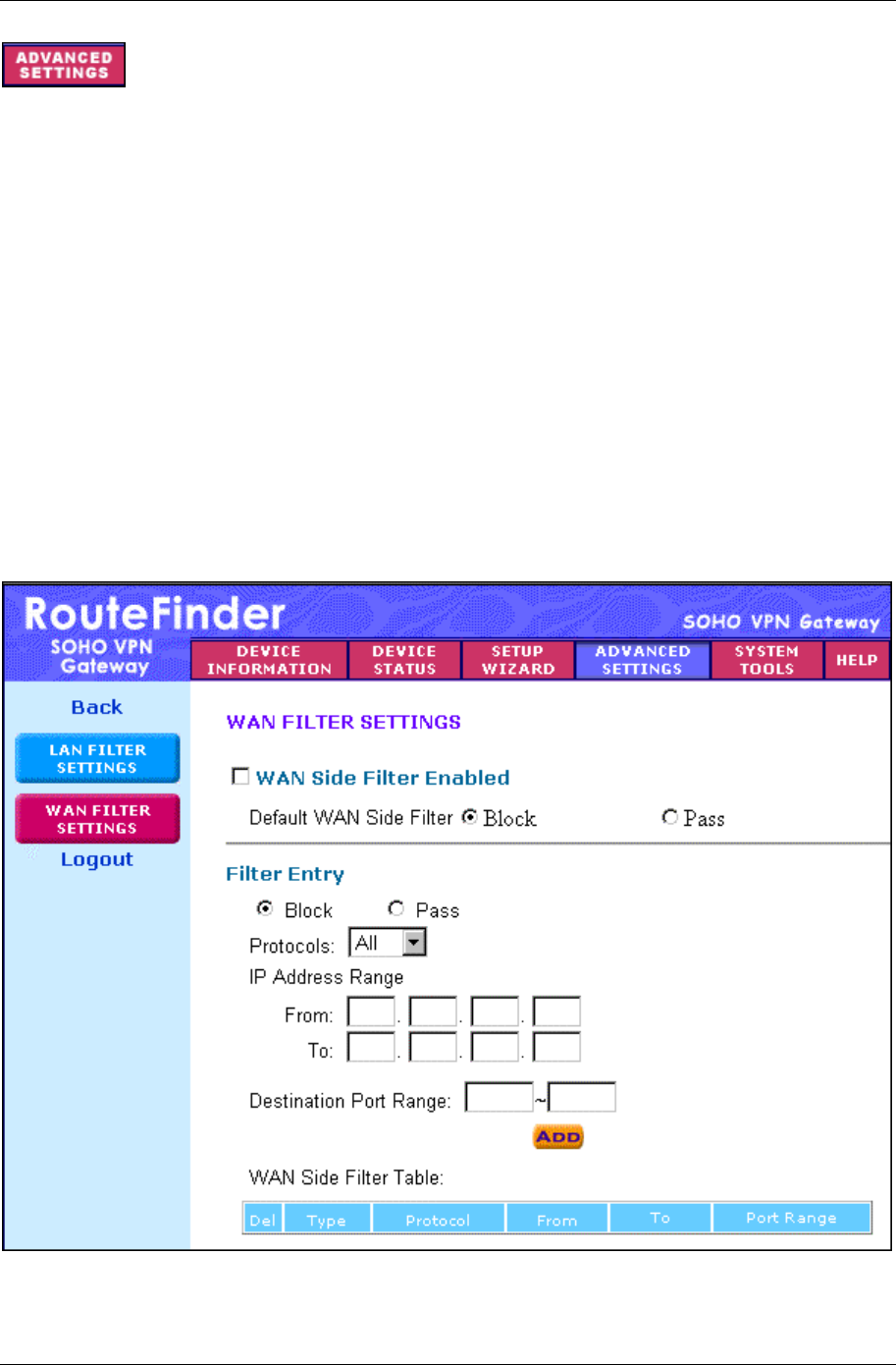 WAN Filter Settings button on the left side of the screen. The WAN Filter Settings screen